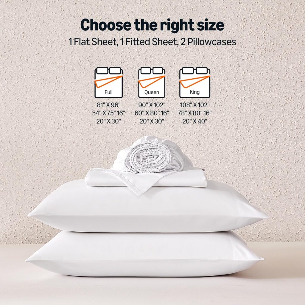 - WHAT’S INCLUDED: King-size set with 1 Flat Sheet (108″ x 102″),1 Fitted Sheet (78″ x 80″ x 16″), 2 Pillowcases (20″ x 40″)
